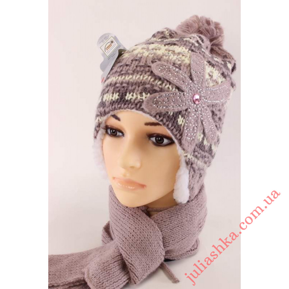 зимовий в'язаний комплект для дівчат -шапочка на хутряному підкладі та шалик