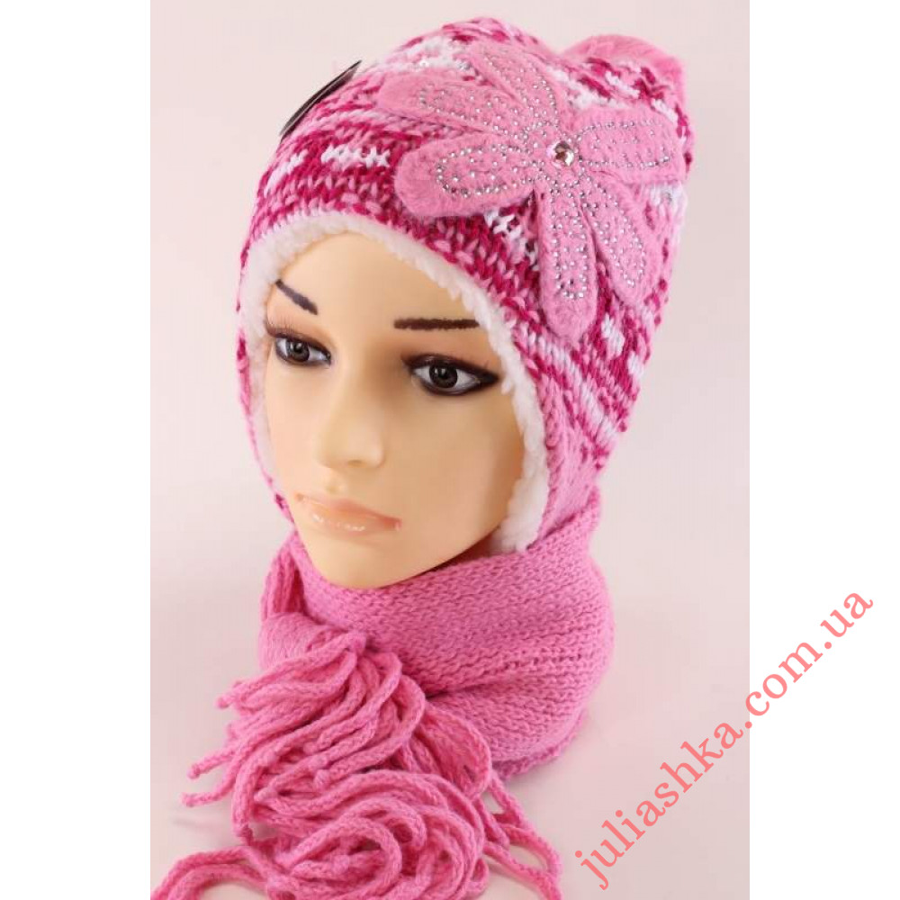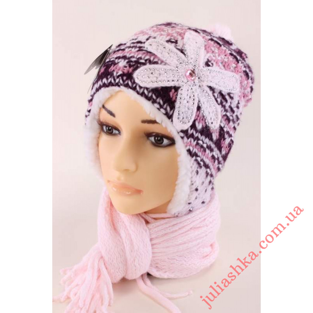 зимний вязаный комплект для девочек -шапочка на меховом подкладе и шарф